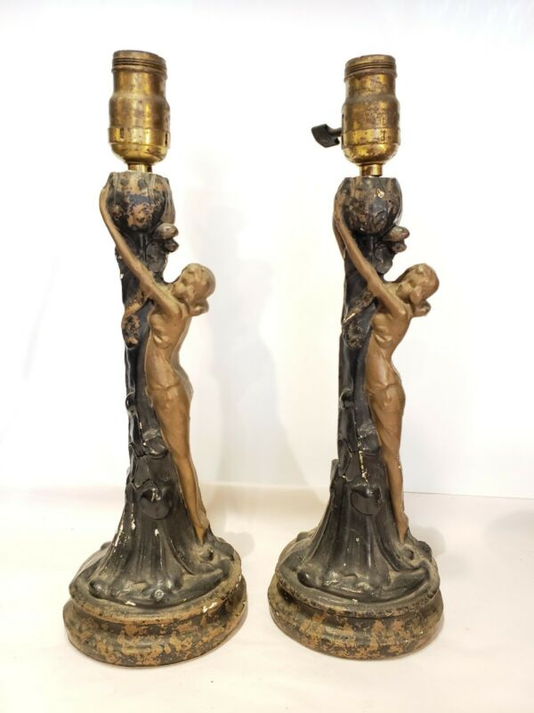 Antique Pair of Art Nouveau Plaster Table Lamps Vintage Lighting