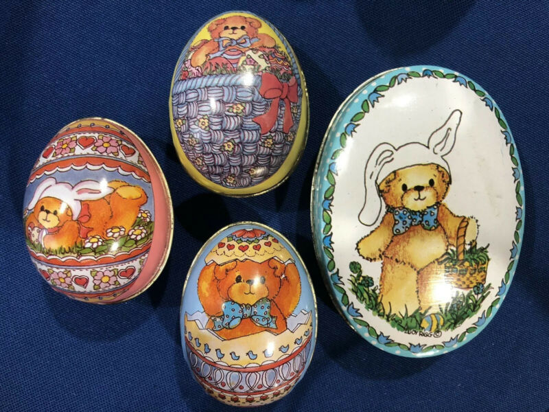 Title (ebay affiliate link): HTF~ Lot of 4 1982 1985 Lucy and Me Bears Egg Shaped Surprise Tins for Easter