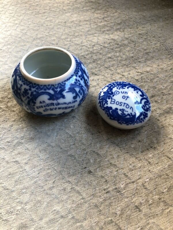 Title (ebay affiliate link): Antique, flow-blue Countie of Boston, Magda Toilet Cold Cream Jar pot lid