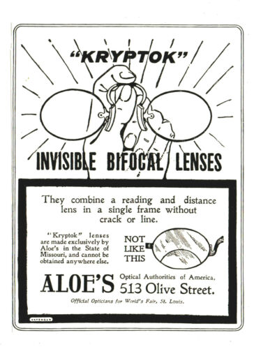 Title (ebay affiliate link): 1903 A. S. ALOE CO, OPTICIANS, ST LOUIS, MISSOURI KRYPTOK BIFOCAL EYE GLASSES AD