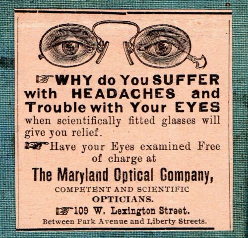 Title (ebay affiliate link): 1889 MARYLAND OPTICAL CO, BALTIMORE MARYLAND HEADACHE EYE GLASSES ADVERTISEMENT
