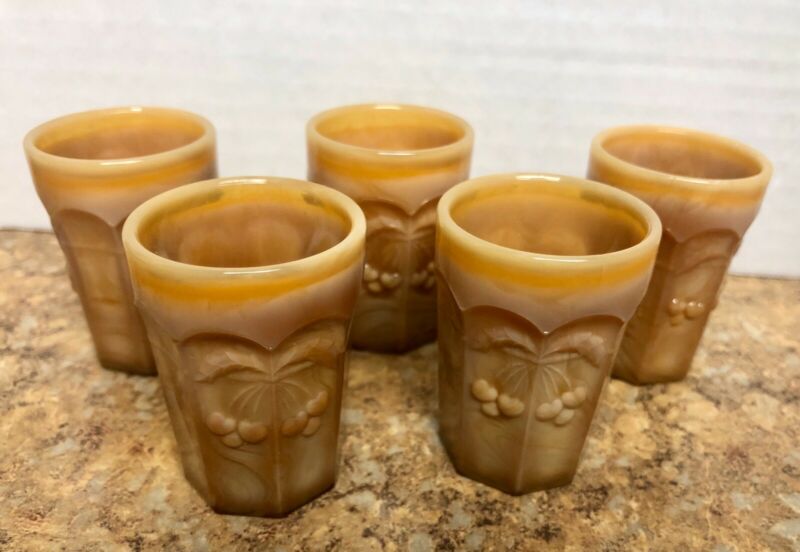 Title (ebay affiliate link): Moser Chocolate Slag Milk Glass 5 Jennifer Miniature Child Cherry Tumbler Set