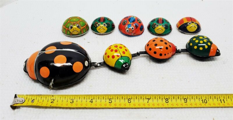 VINTAGE 1959 TPS JAPAN TIN LITHO WIND UP LADYBUG FAMILY PARADE + BONUS BUGS