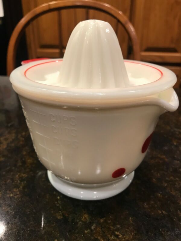Title (ebay affiliate link): Vintage Hazel Atlas White Milk Glass 2 CUP MEASURING CUP Reamer 3 Red Polka Dots