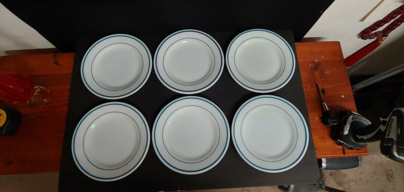 6 Vintage Pyrex Milk Glass Restaurant Ware Double Teal Blue Stripe 9" Plates