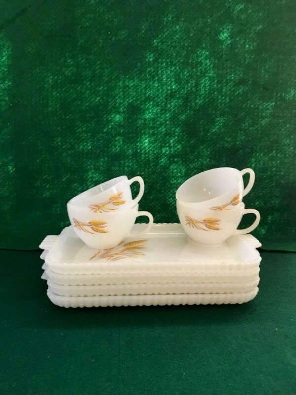 Vtg Lot 4 Fire King Wheat Snack Set Tray Cup Milk Glass