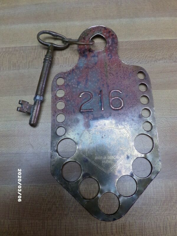 Title (ebay affiliate link): VINTAGE BRASS KEYES-DAVIS LAUNDRY PIN HOLDER, MILITARY, HOTEL BRASS SKELETON KEY