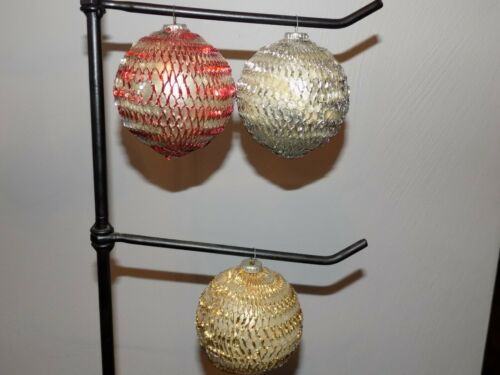 3 Vintage JAPAN METAL MESH WIRE WRAPPED Glass Christmas Tree Ornaments 1950''s
