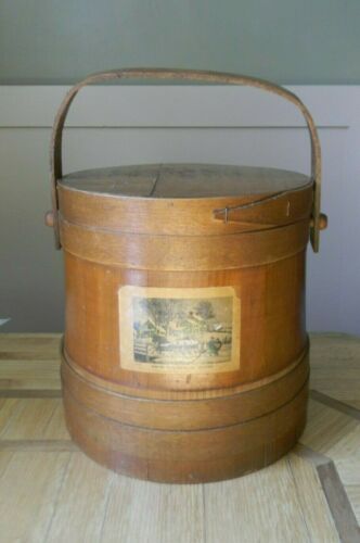 Title (ebay affiliate link): Vintage Firkin Primitive Sugar Bucket Pail with Cover Currier & Ives Label