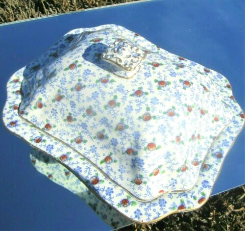 VINTAGE WHITE BLUE FLORAL CHINTZ VEGETABLE CASSEROLE SERVER TUREEN GREAT BRITAIN