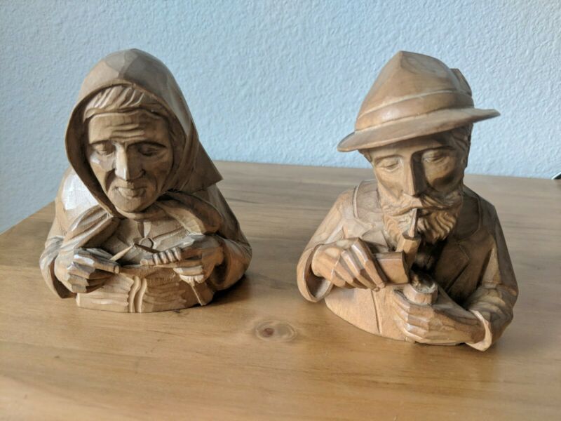 Wooden Carving Bust Statue Set Hand Carved Knitting Smoking Couple