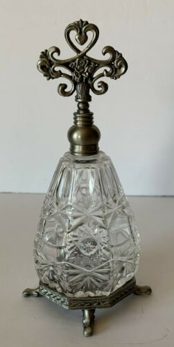 Title (ebay affiliate link): Beautiful Vintage Fancy Tall Pressed Cut Glass & Metal Perfume Bottle & Stopper