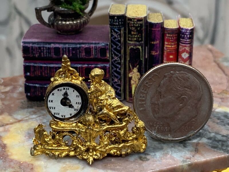 Title (ebay affiliate link): Vintage Dollhouse Miniature Gold Leaf Paper Face Figurine Clock