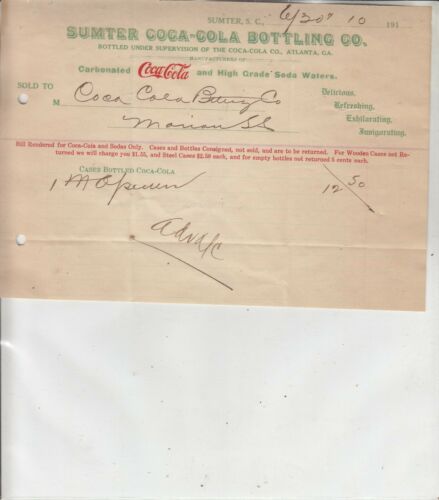 Title (ebay affiliate link): SUMTER COCA-COLA BOTTLING CO. INVOICE DATED 6/30, 1910 110 YEARS OLD