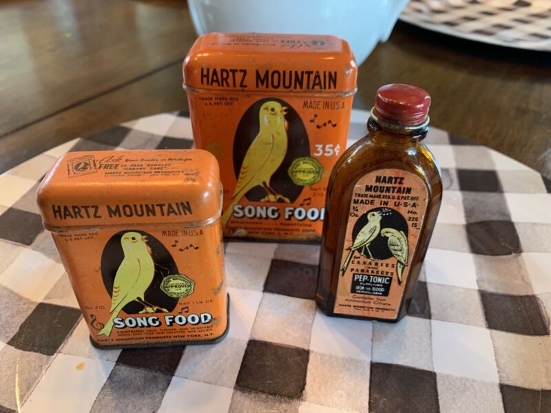 Title (ebay affiliate link): Hartz Mountain Song Food Advertising Tin Bird Feed, Small Tin, Bottle Pep Tonic