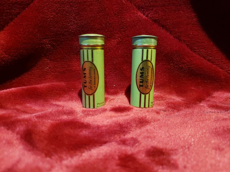 Title (ebay affiliate link): Vintage Pair of Round Tums For The Tummy Push Bottom Tin Advertising