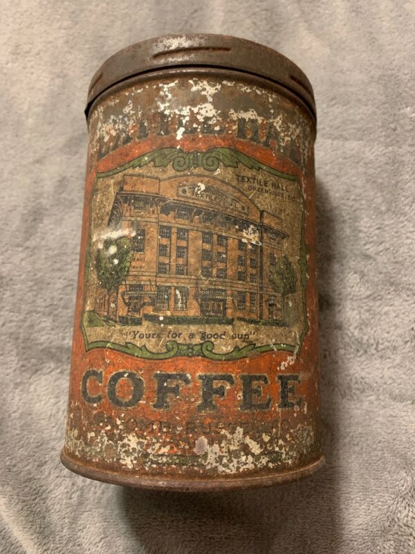 VINTAGE TEXTILE HALL COFFEE TIN LIPSCOMB-RUSSELL CO GREENVILLE, SOUTH CAROLINA