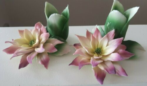 Pair of Vintage Capodimonte Porcelain Pink Yellow Chrysanthemum Candle Holders