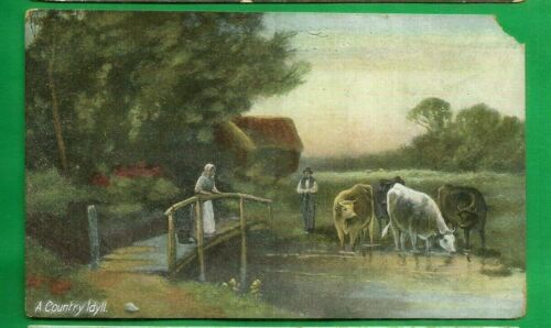 Title (ebay affiliate link): A Country Idyll/ lady on old bridge/man/cattle drinking from pond/art postcard