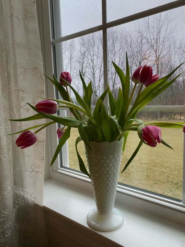 Title (ebay affiliate link): Vintage Large Scalloped Edge, Polkadots Hobnail Milk Glass Footed Vase