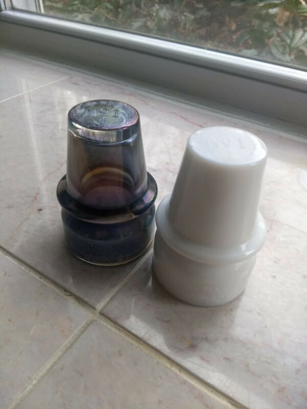 60th Anniversary Telephone Pioneers No. 1 Insulators- Pair Milk Glass & Carnival