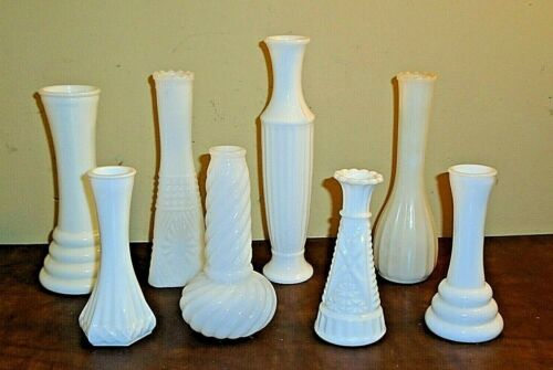 Title (ebay affiliate link): 8 White Milk Glass Flower Bud Vases Vintage Collectible Wedding Shower Party