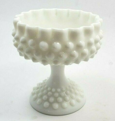 Title (ebay affiliate link): Vintage White Milk Glass Hobnail Pedestal Candy Dish Ruffled Rim 6" Tall