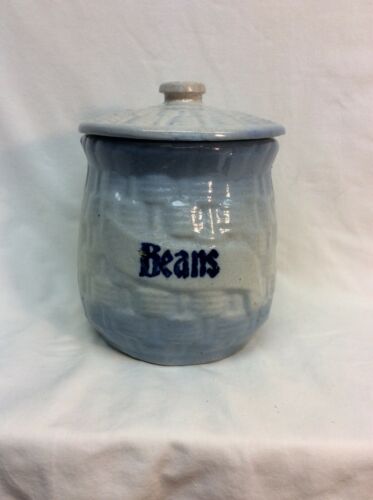 Title (ebay affiliate link): EARLY ANTIQUE PRIMITIVE BLUE & WHITE STONEWARE BEANS CANISTER BASKET WEAVE CROCK