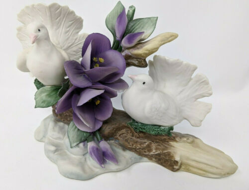 Title (ebay affiliate link): Capodimonte Porcelain Purple Irises w/ 2 Doves on Wood Log 8" W x 6" T Italy