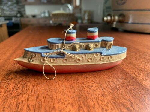 Title (ebay affiliate link): Antique Christmas Tree Ornament Celluloid Rattle Steamship Boat Original Label
