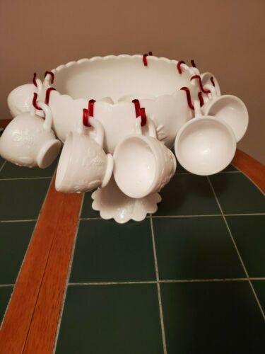 Title (ebay affiliate link): Westmoreland milk glass punch bowl 3 fruit pattern w/ 12 cups
