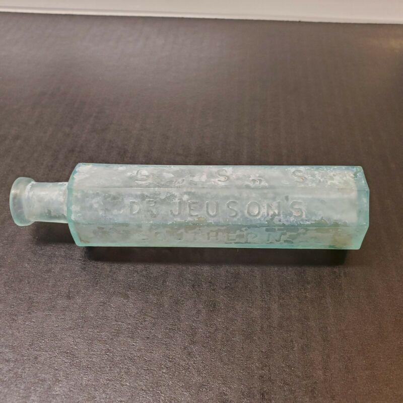 Title (ebay affiliate link): Antique blown bottle DR.JEUSONS SOUTHERN SOOTHING SYRUP rainbow patina