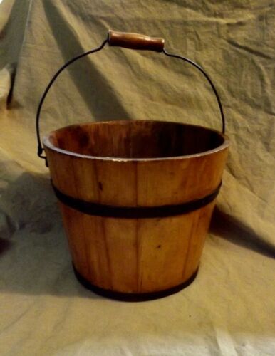 Title (ebay affiliate link): Primitive Antique 8.5" Wood Bucket Looks Restored Outside 2 Metal Bands