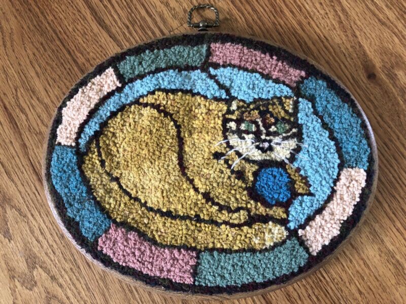 Title (ebay affiliate link): Antique Estate Punchwork Hooked Rug Folk Art Primitive Cat Wall Hanging Plaque