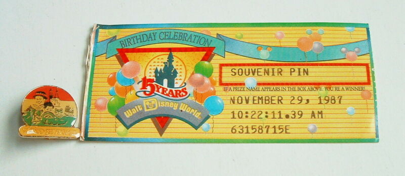 Title (ebay affiliate link): 1987 DISNEY WORLD 15TH ANNIVERSARY WINNING TICKET WITH WORLD SHOWCASE PIN PRIZE