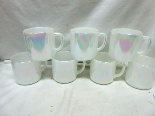 Title (ebay affiliate link): Set of 7 FEDERAL Milk Glass Rainbow Iridescent White Cups Pearl Luster 3" Mugs