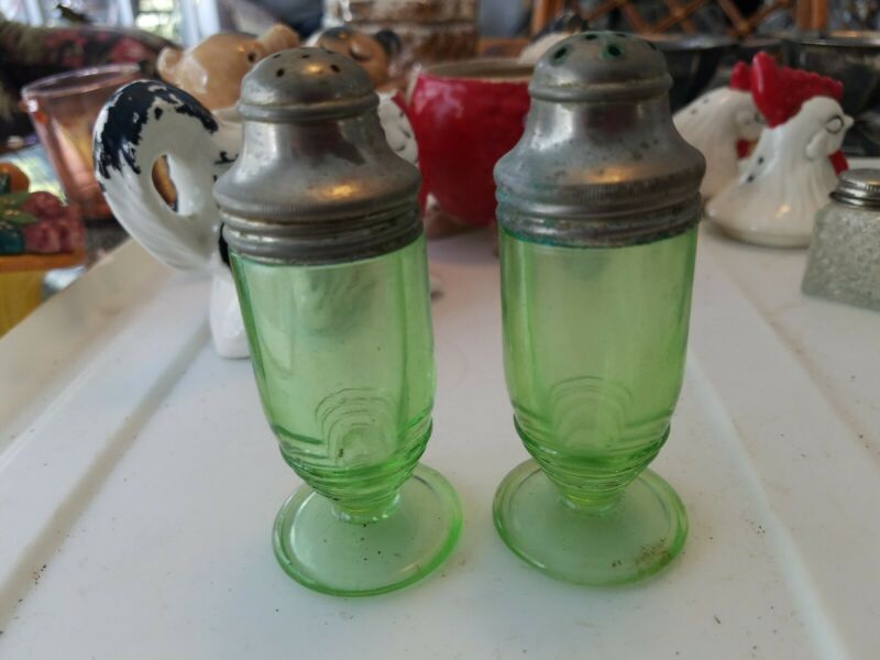 Title (ebay affiliate link): Hazel Atlas Depression Clear Green Glass Salt Pepper Shaker Set with metal tops.