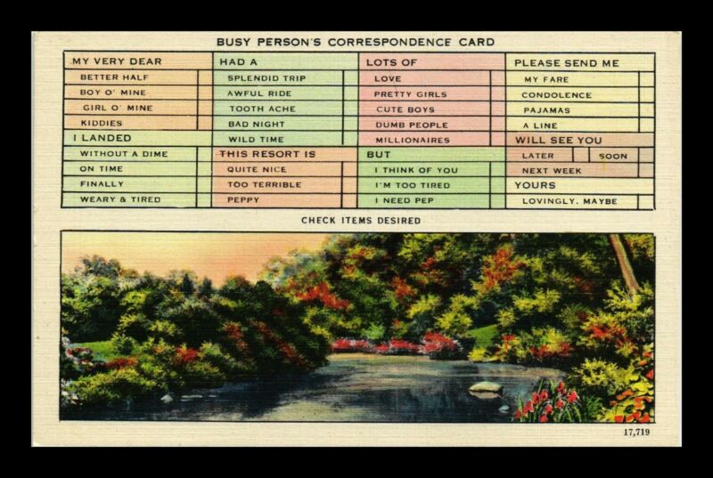 Title (ebay affiliate link): US POSTCARD PICTURESQUE RIVERSTREAM BUSY PERSONS CORRESPONDENCE CARD LINEN