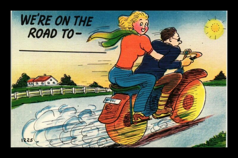 Title (ebay affiliate link): US LINEN HUMOR POSTCARD ON THE ROAD COUPLE ON MOTORCYLE DRIVING