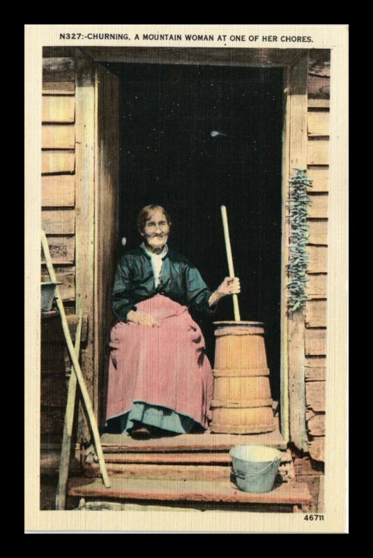 Title (ebay affiliate link): US POSTCARD LINEN MOUNTAIN WOMAN CHORE CHURNING ON CABIN PORCH