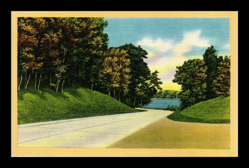 Title (ebay affiliate link): PICTURESQUE WINDING ROAD TO LAKE THROUGH FOREST LINEN US POSTCARD