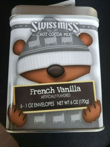 Title (ebay affiliate link): EMPTY Swiss Miss French Vanilla Hot Cocoa Mix Holiday Bear Tin Box Silver Bell
