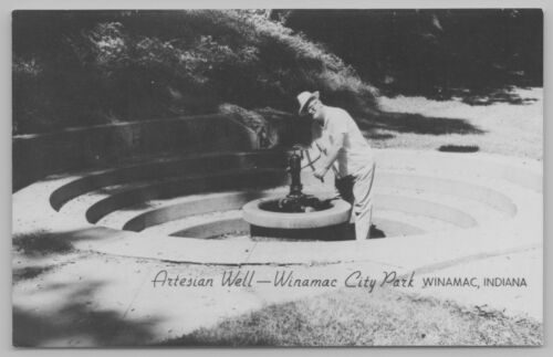 Title (ebay affiliate link): Winamac Indiana~City Park~Old Fella at Artesian Well~Hand Pump~1940s RPPC