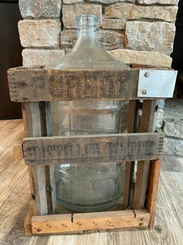 Title (ebay affiliate link): Antique Pureoxia Distilled Water Jug Wooden Frame Bottle in Crate - Rustic