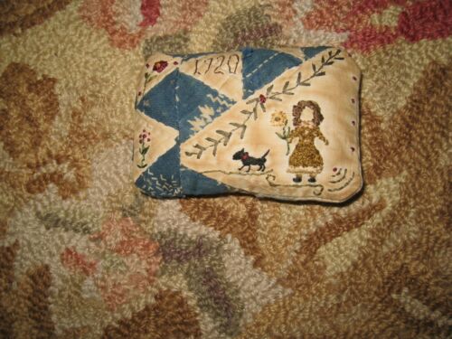 Primitive tiny Sampler Pillow~1720 Ms Maggie & Dog Molly ~Early Quilt~ Folk Art