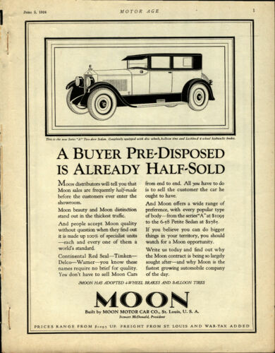 Title (ebay affiliate link): 1924 Moon Motor Cars Ad: Series A Two Door Sedan - St. Louis, Missouri