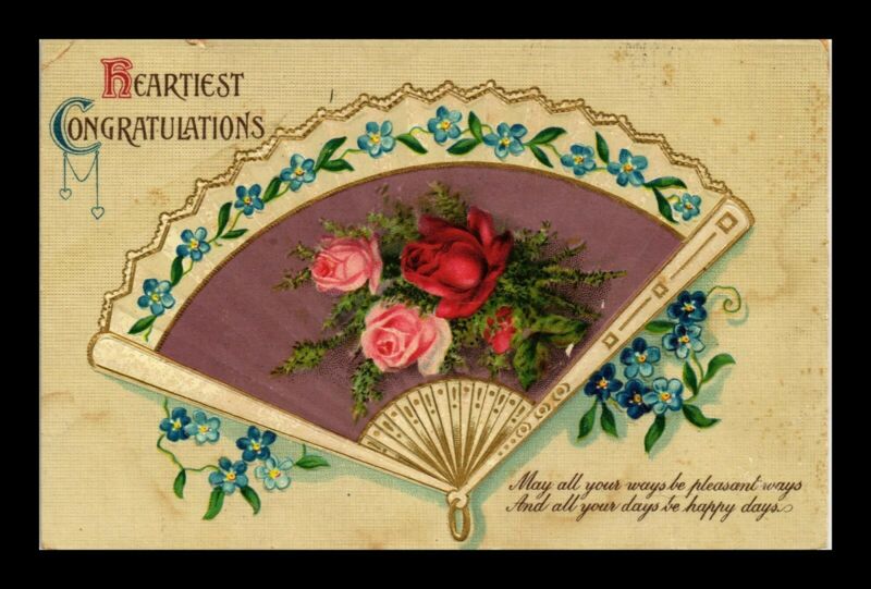 US POSTCARD HEARTIEST CONGRATULATIONS EMBOSSED FAN BLUE FLOWERS RED ROSES GOLD