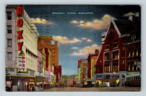 Tacoma WA, Night, Roxy Theatre, Telenews, Bank, Linen Washington c1953 Postcard