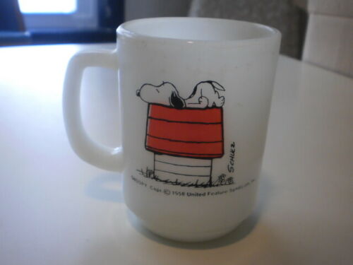 Title (ebay affiliate link): Vtg Fire King Milk Glass Peanuts Snoopy Coffee Mug~D Handle~Allergic To Morning
