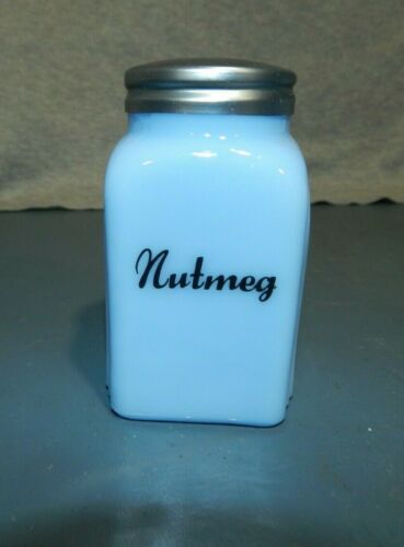 Title (ebay affiliate link): DELPHITE BLUE MILK GLASS "Nutmeg" SHAKER Arched Sides Black Lettering 4"